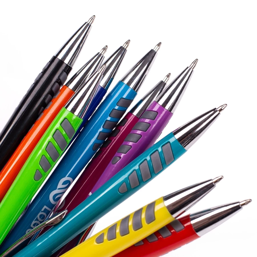 Wszyscy, którym zależy na tym, by długopisy reklamowe wykorzystywane w ich działaniach marketingowych, były przede wszystkim wygodne w użytkowaniu, będą zainteresowani modelem Merkury. Ten długopis reklamowy z nadrukiem został w przemyślany sposób wyprofilowany, zaś tuż nad końcówką umieszczono elementy, dzięki którym możliwy jest pewniejszy i wygodniejszy chwyt podczas pisania. Długopisy plastikowe Merkury zostały stworzone z trwałego tworzywa ABS w kilku różnych, wesołych kolorach. Części dodatkowe, takie jak końcówka, klips oraz przycisk włączający wykonano ze srebrzystych elementów. Całość przyciąga wzrok kolorystyką, jak i jakością wykonania. Na obudowie długopisu reklamowego Merkury możemy wykonać dowolne jednokolorowe logo bądź napis metodą tampodruku.