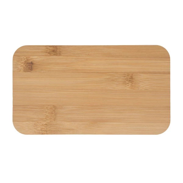 Dodatkowe informacjeLunch box zamykany taśmą elastyczną. Wyposażony w widelec, łyżkę, nóż oraz bambusową deseczkę do krojenia.