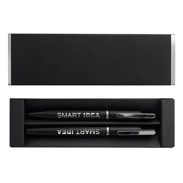 Dodatkowe informacjezestaw upominkowy składający się z metalowego długopisu i pióra kulkowego. Możliwość wygrawerowania błyszczącego logo, pasującego kolorem do metalowych detali długopisu.